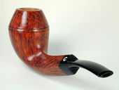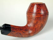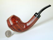 Large Bent Bulldog beautifully sculpted to reveal the bowl's grain. Black diamond shank saddle plexi stem. Leather pipe bag included. Group 4.