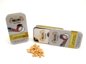 "Keystones" by Erik Nording. Naturally formed clay pellets. Absorbs moisture by placing in the bottom of the pipe bowl before filling with tobacco. The Nording Eriksen pipe is designed with a special chamber to hold the Keystones below the tobacco bowl and filter and dry the smoke. Two tins - 0.05 oz/ 14 g. each.