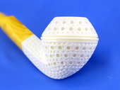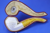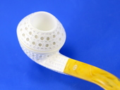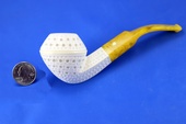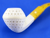 BENT BULLDOG - Half-bent diamond shank bulldog with mini-lattice finish and diamond saddle bakelite yellow swirl stem. Custom-fitted velvet-lined SMS logo case included.