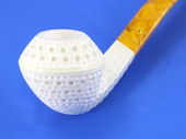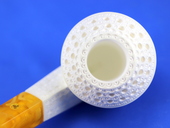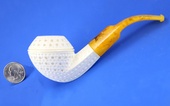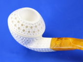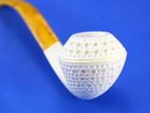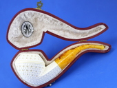 BENT BULLDOG - Half-bent diamond shank bulldog with mini-lattice finish and diamond saddle bakelite yellow swirl stem. Custom-fitted velvet-lined SMS logo case included.